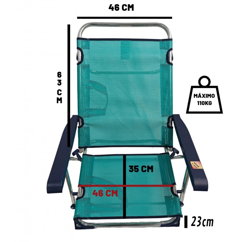- Medidas (silla abierta): Longitud total de la silla, cuando está completamente horizontal - Acostado: 100 cm. Altura del respaldo: 63 cm. Profundidad del asiento: 39 cm. Ancho del asiento: 59 cm. Altura del suelo al asiento: 23 cm;